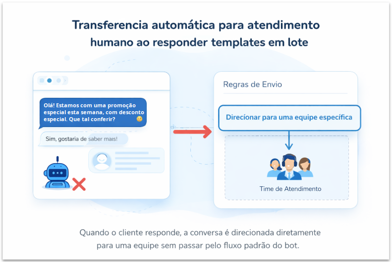 A transferência automática para atendimento humano ao responder templates enviados em lote é uma funcionalidade estratégica que aprimora significativamente a experiência do cliente.