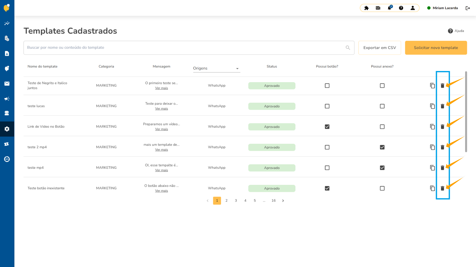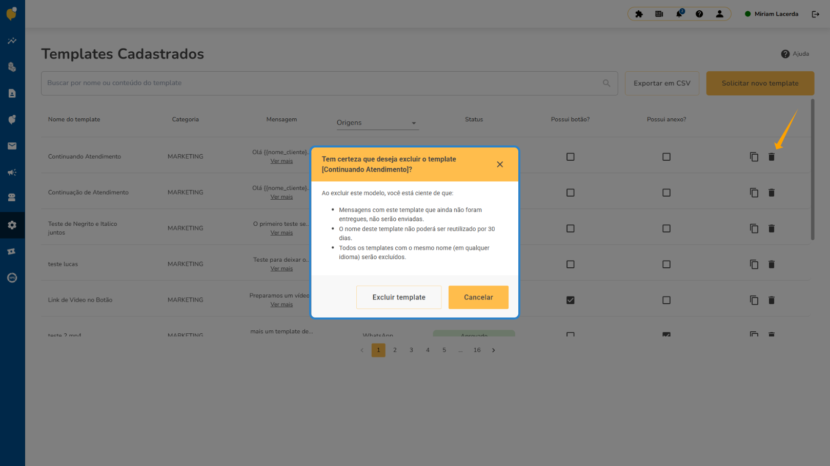 Ao remover um template na nossa plataforma, ele será automaticamente deletado na Meta, garantindo que tudo aconteça de forma rápida e sincronizada.
