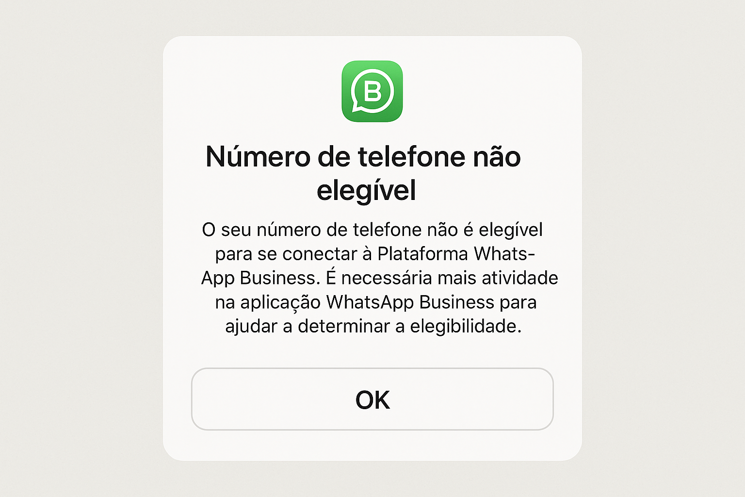 O número já esteve vinculado anteriormente a uma conta WhatsApp API (WABA), o que pode manter registros temporários e impactar a elegibilidade.