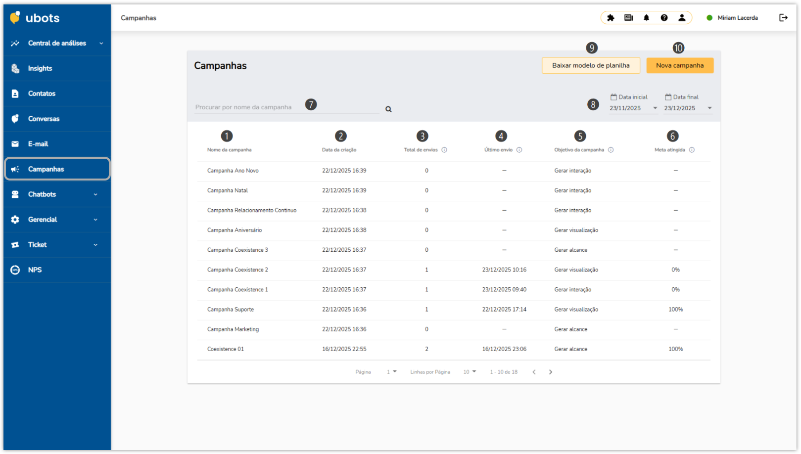 A Tela de Campanhas da Ubots foi desenvolvida para tornar a experiência de envio mais inteligente, organizada e eficiente, tanto para quem realiza os disparos quanto para quem acompanha e coordena as ações.