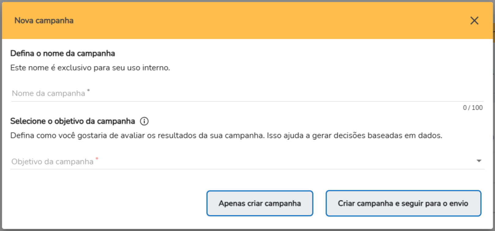 Em ambos os cenários, ao criar uma nova campanha é necessário informar o nome e o objetivo da campanha.