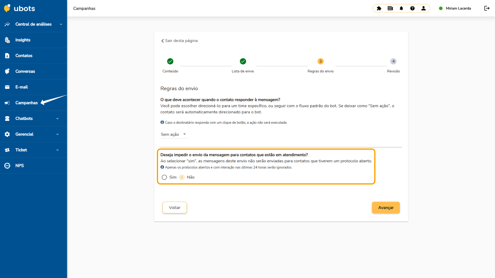 Caso a opção “Não” seja selecionada, o envio ocorrerá normalmente, independentemente de o contato possuir ou não um protocolo aberto.