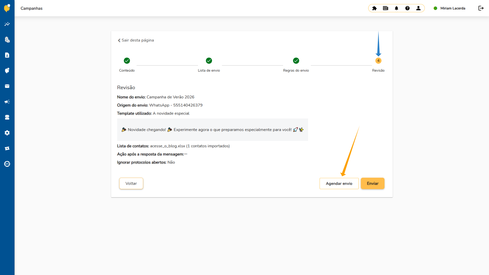 Essa etapa oferece mais controle e tranquilidade no planejamento das campanhas, garantindo que suas mensagens sejam enviadas no momento ideal para o seu público.