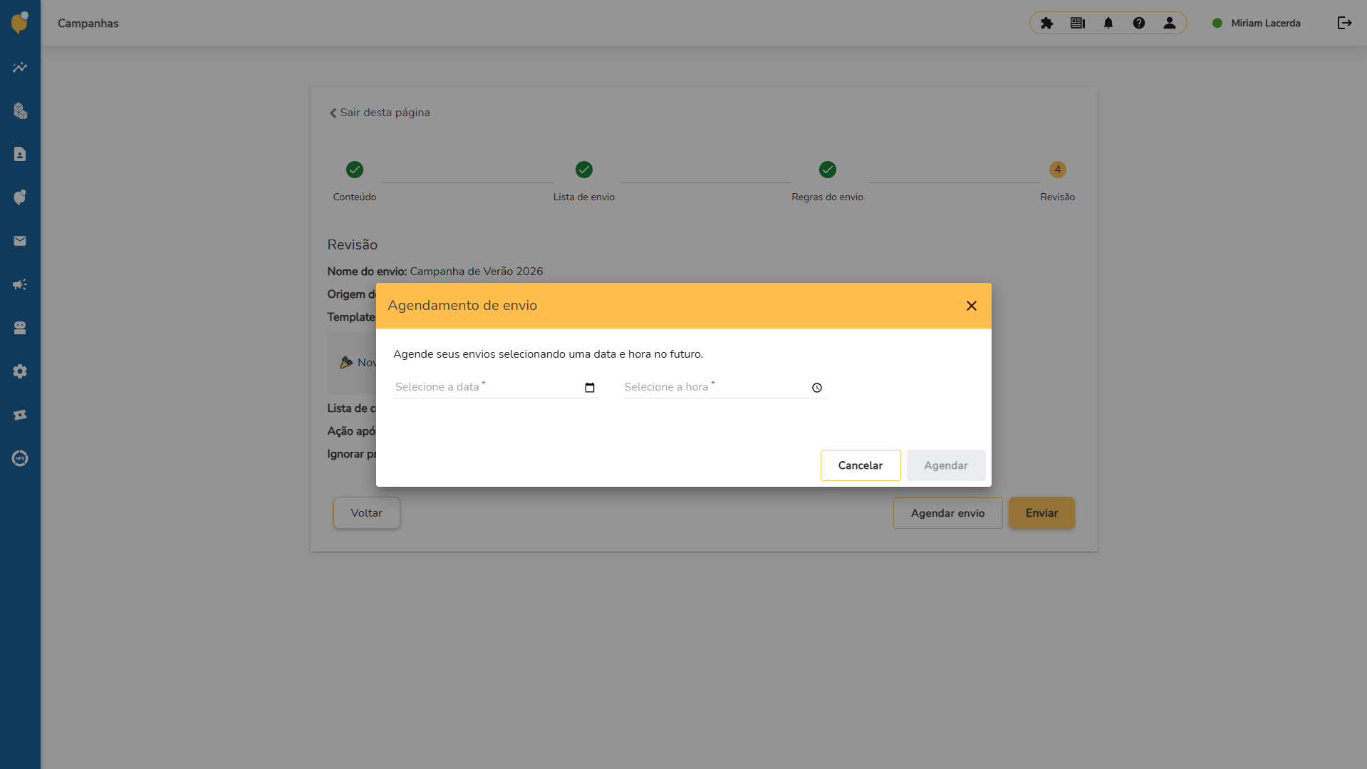 É nesse momento que você define se o envio será realizado imediatamente ou se ficará agendado para uma data e horário específicos.