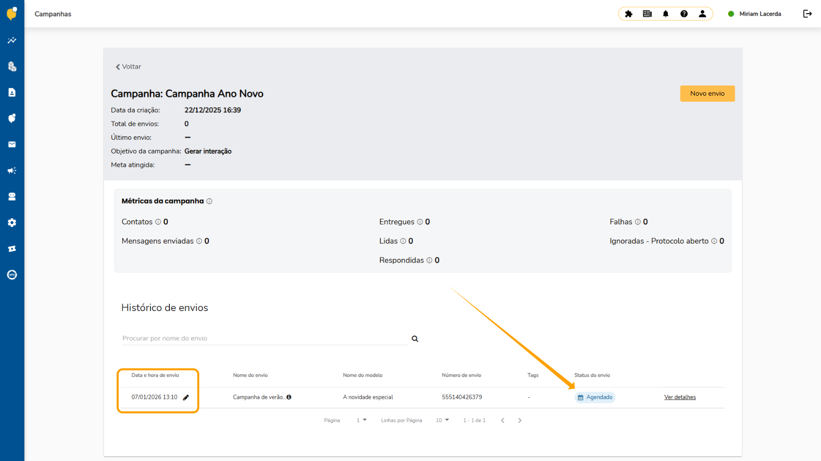 No histórico, o status Agendado aparece destacado ao lado do envio, permitindo fácil identificação e acompanhamento.