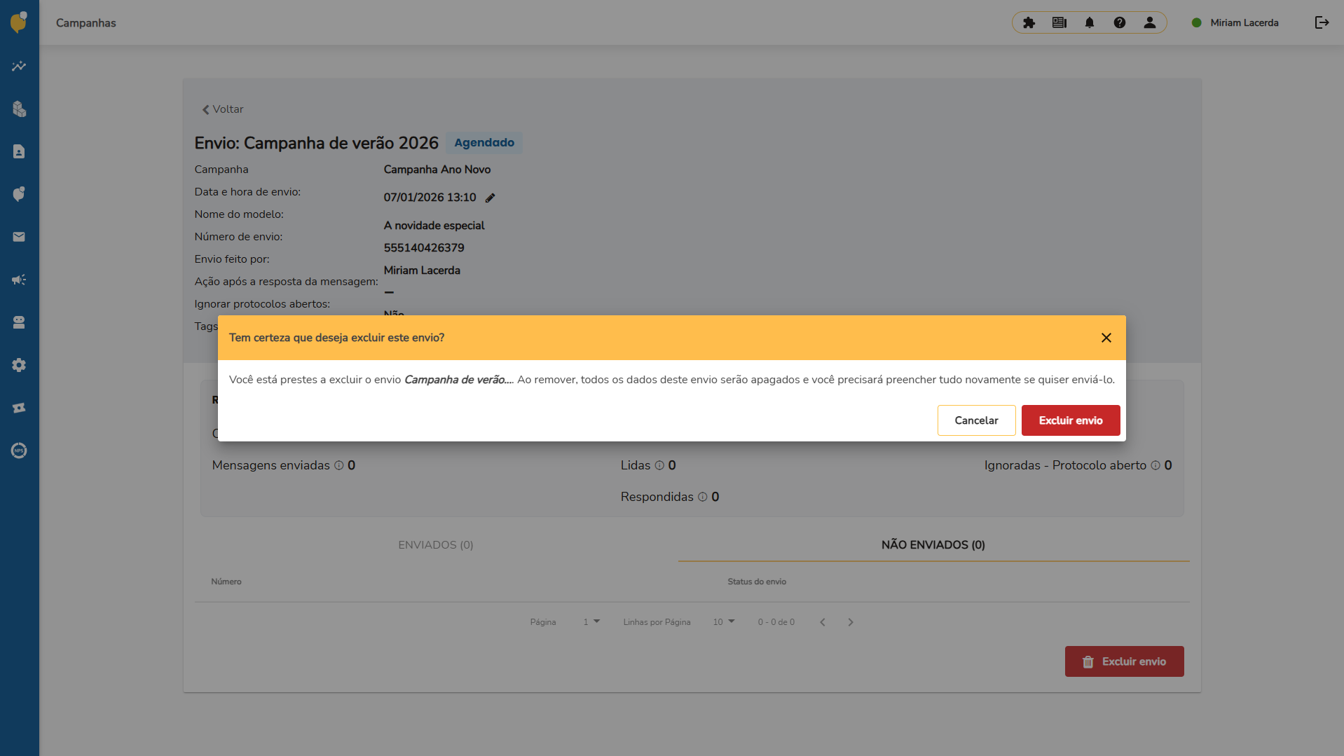 Após a confirmação, o envio agendado será removido e nenhuma mensagem será enviada.