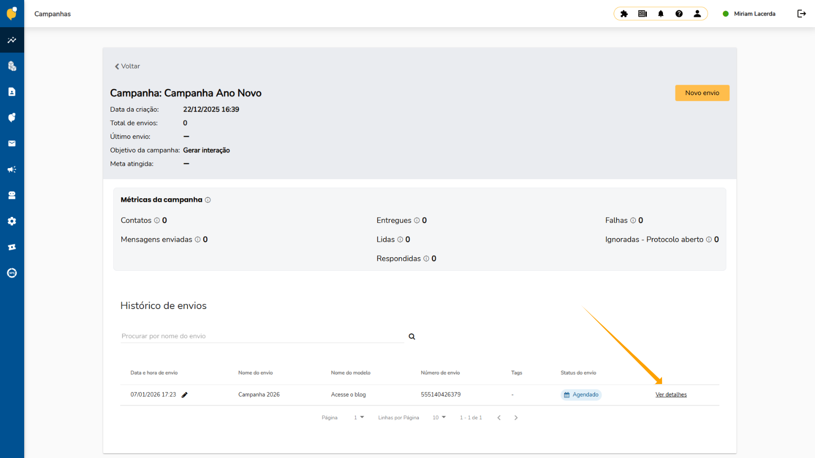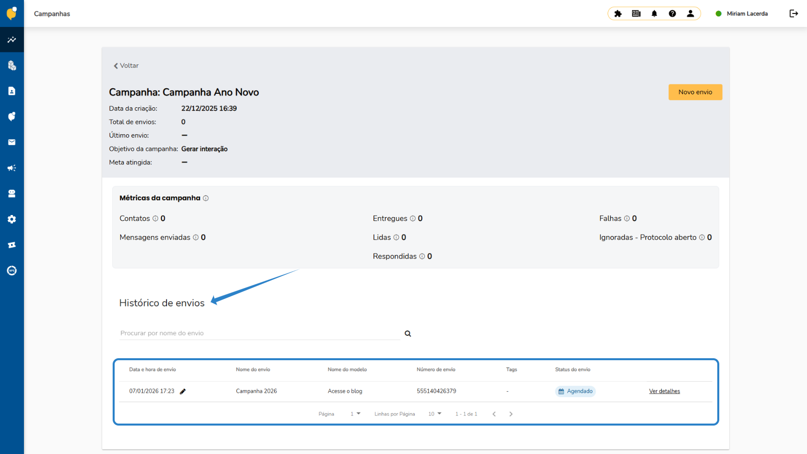 No menu "Campanhas", localize a campanha desejada e role a tela até a seção "Histórico de envios".