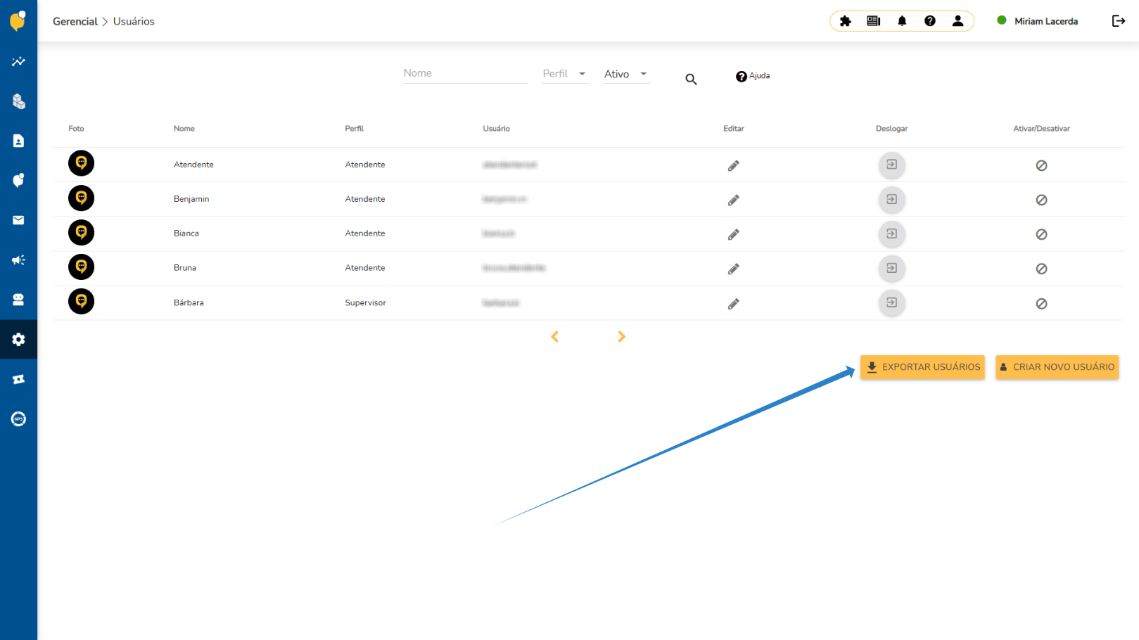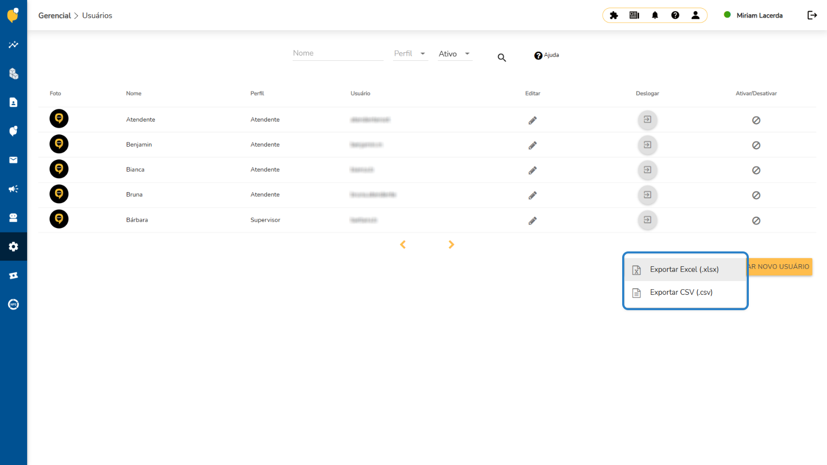 A funcionalidade de exportação está disponível no caminho "Gerencial > Usuários", por meio do botão Exportar usuários, localizado na parte inferior direita da tela.