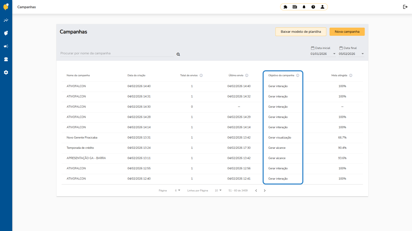 O objetivo da campanha indica a finalidade definida durante a criação e serve como referência principal para avaliar o desempenho da ação.