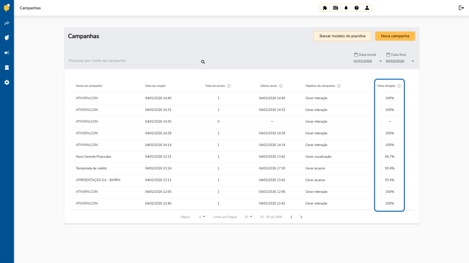 A meta atingida apresenta o percentual de sucesso da campanha com base no objetivo definido, facilitando a análise do desempenho e dos resultados alcançados.