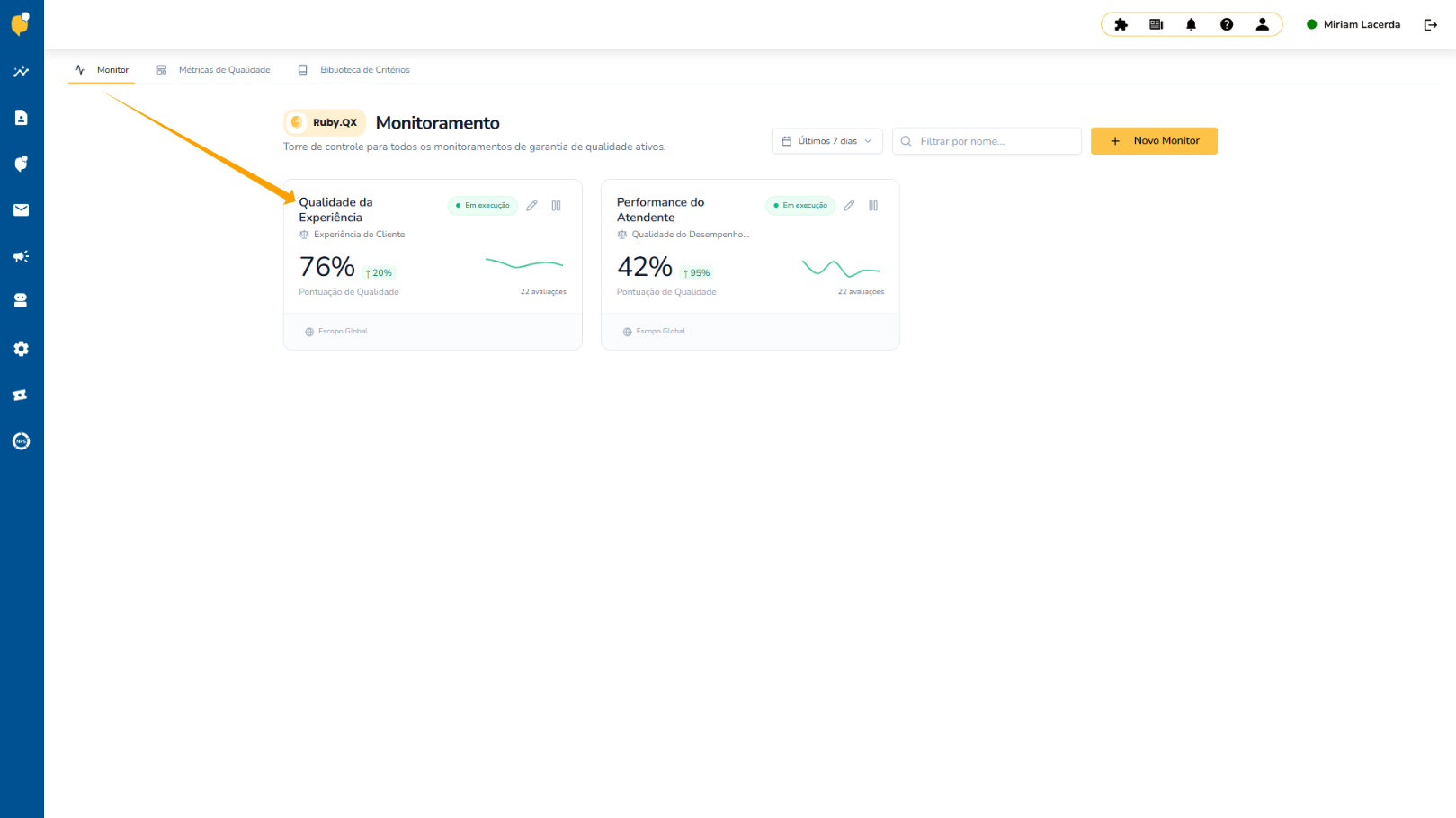 Assim que as questões contratuais forem confirmadas e o aplicativo ativado, o Ruby.QX passa a ficar disponível, por padrão, em "Central de Análises > Monitoramento > Qualidade", facilitando o acompanhamento contínuo da operação e das métricas de qualidade.