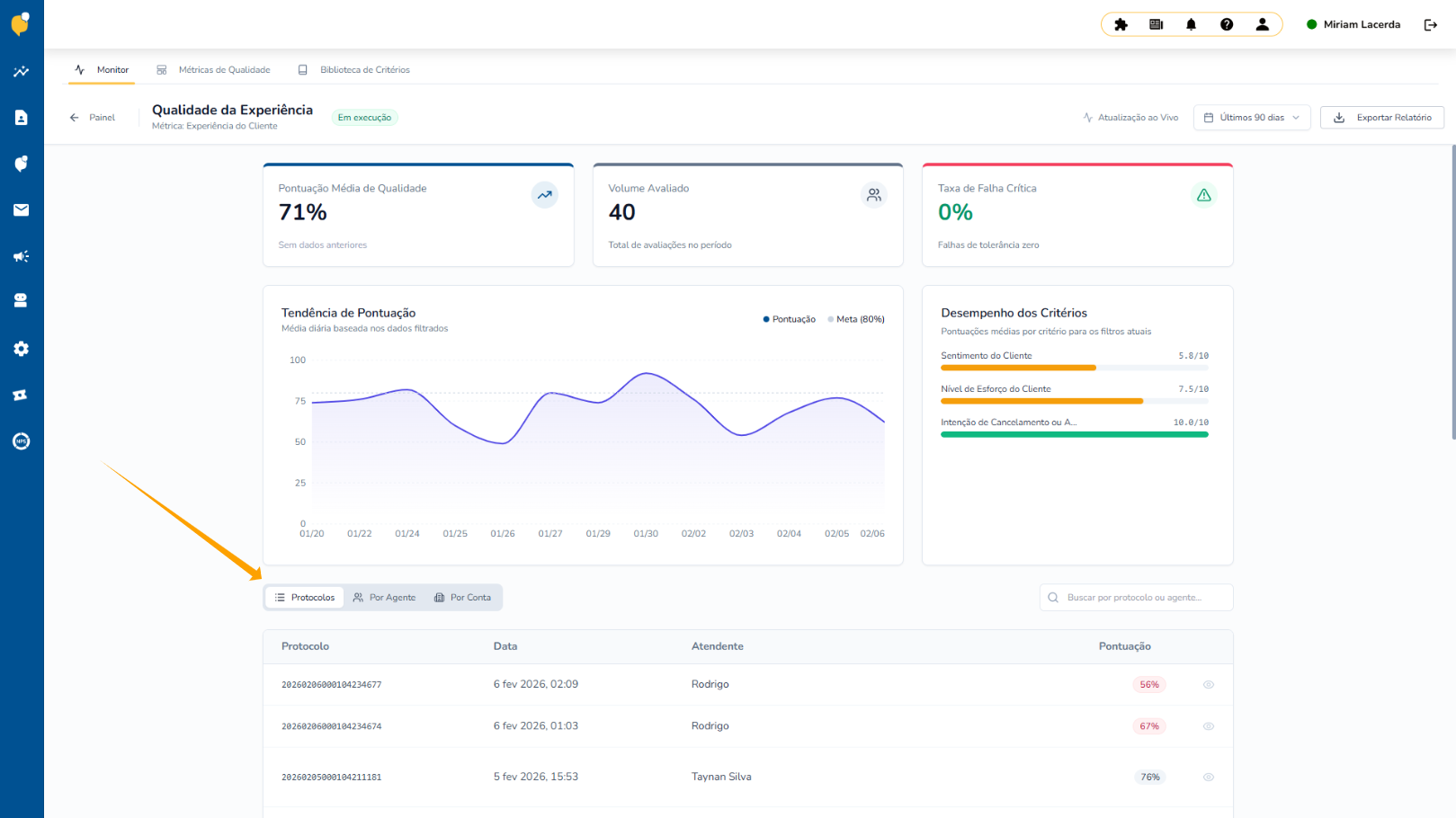 Nele, você pode acompanhar o desempenho de forma detalhada e alternar a visualização conforme sua necessidade, escolhendo entre "Protocolos", "Por Agente" ou "Por Conta".