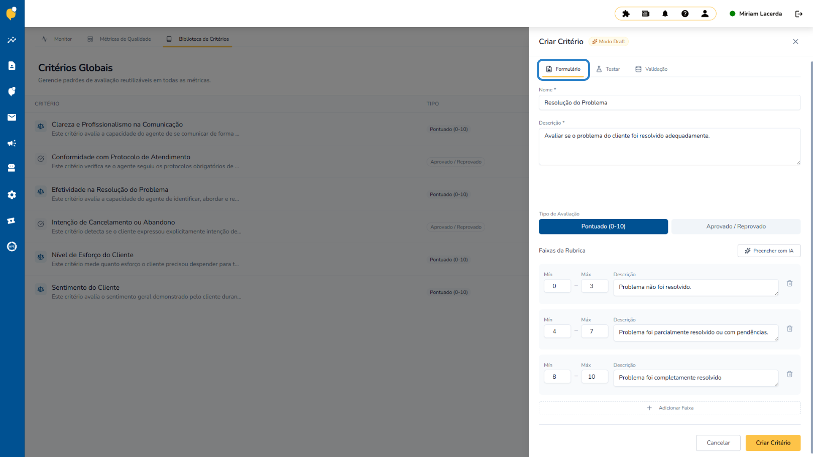Em seguida, você define os critérios que compõem cada métrica, representando os principais aspectos do atendimento que serão analisados pela IA.