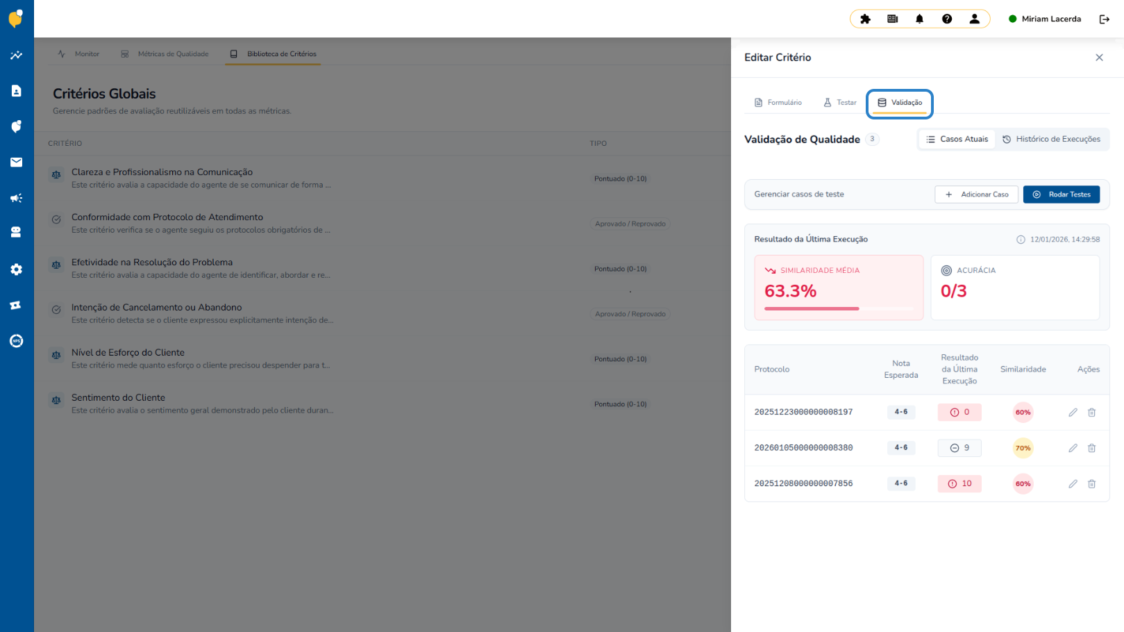 Com base nesses dados, você pode ajustar regras, refinar instruções e aprimorar critérios de forma constante, elevando progressivamente a precisão da IA e fortalecendo a confiança nas análises de qualidade ao longo do tempo.