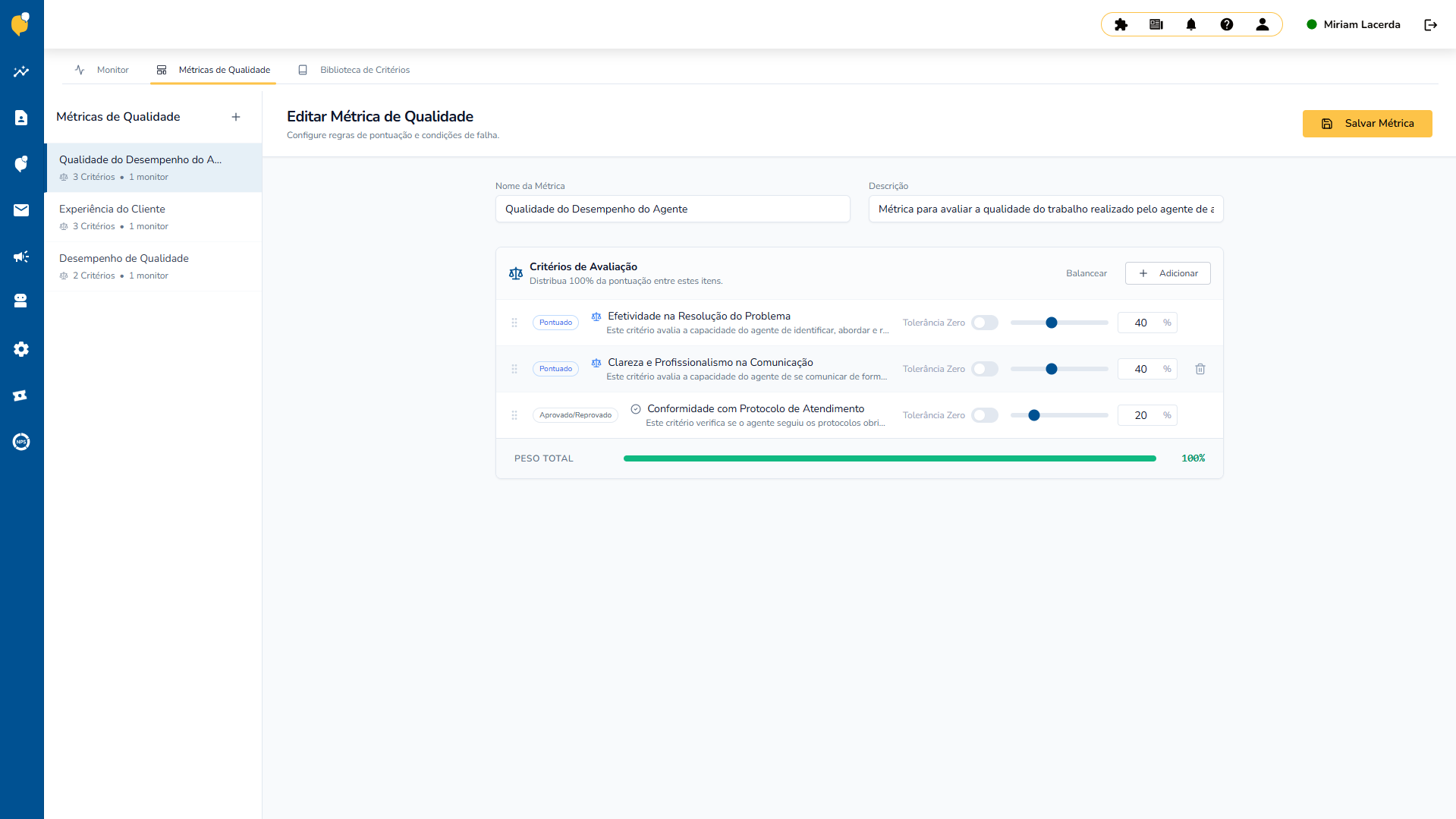 A configuração é totalmente flexível. Você pode editar métricas existentes, criar novas métricas, ajustar pesos manualmente ou utilizar o balanceamento automático. Tudo isso permite que as avaliações acompanhem mudanças nos processos, metas e estratégias de atendimento, com agilidade e segurança.