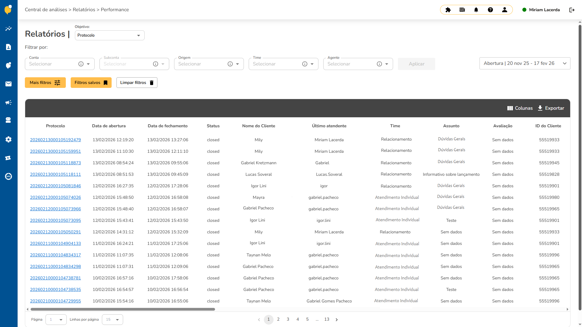 Identificação de Atendimentos: Cada linha apresenta o número do protocolo, permitindo o acesso direto aos detalhes da conversa.