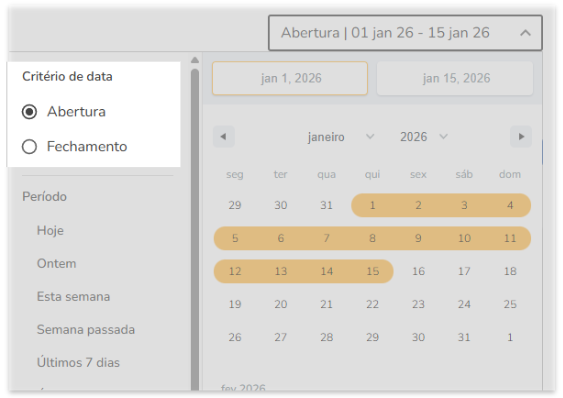 Para tornar a análise de performance mais precisa e alinhada à sua rotina, o seletor de data agora conta com uma funcionalidade que define a origem do período consultado.