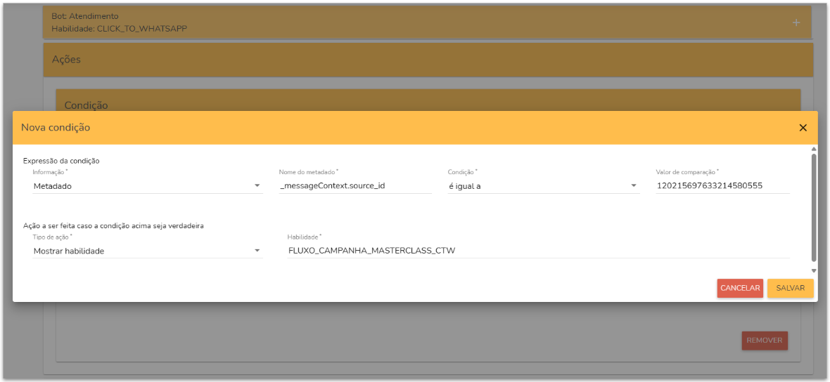 Agora, você deve definir o caminho que o cliente percorrerá com base na campanha clicada. No componente de Condição, preencha os campos conforme as orientações abaixo: