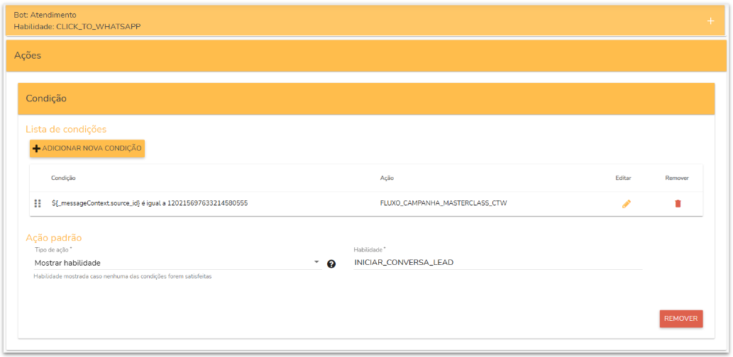 Crie ou localize uma habilidade com o nome exato: CLICK_TO_WHATSAPP