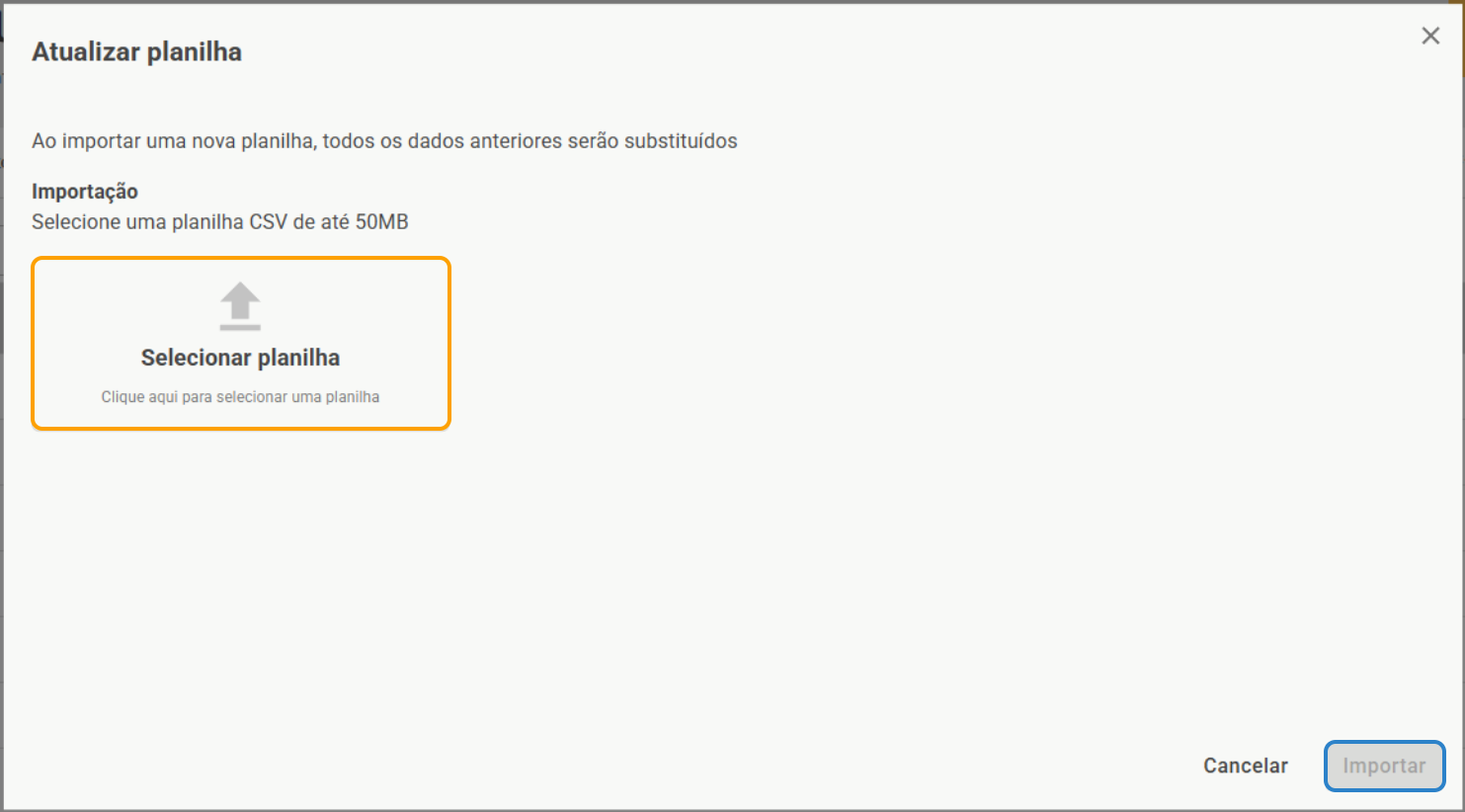 3. Escolha o novo arquivo no seu computador (o formato deve ser obrigatoriamente CSV).