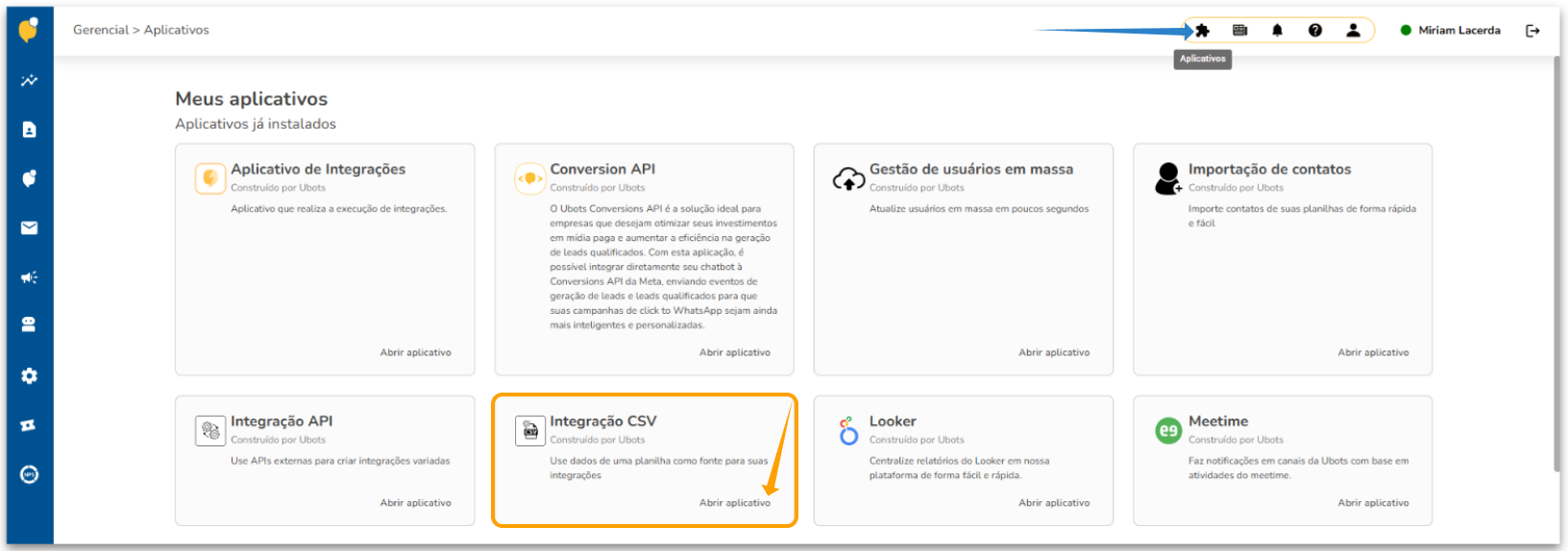 2. Na parte superior da página, localize o ícone de "Aplicativos" (representado por um quebra-cabeça) e clique nele para acessar a "Central de Aplicativos".