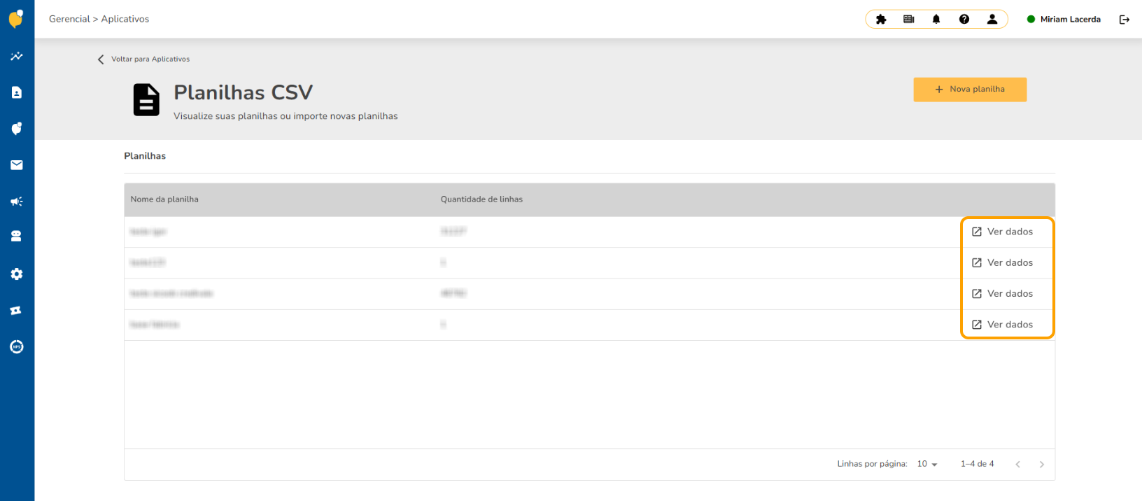 3. Na lista, clique em "Integração CSV" para abrir o gerenciador de planilhas.